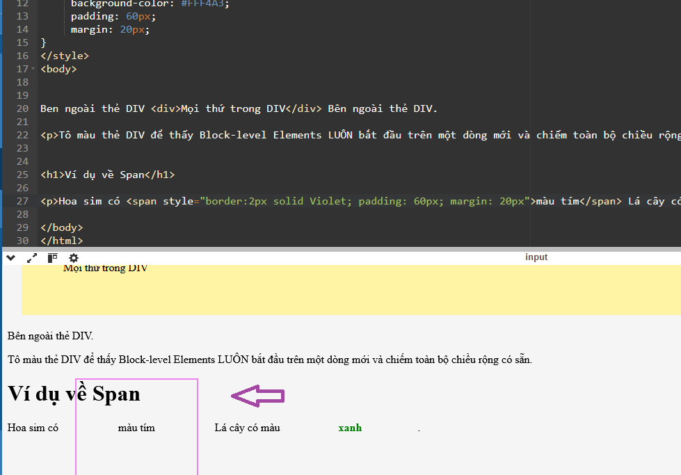 Bạn sẽ thấy phần "màu sắc" đã "giãn nở" ra 20px cả bốn chiều, nhưng thẻ <div> mặc định nó đã "nở trọn" ra bên phải nên sự thay đổi chỉ thấy ở ba chiều còn lại. Còn thẻ <span> chúng ta sẽ thấy border nở đều cả 4 chiều, mỗi chiều tăng thêm 20px. Nếu bạn tăng lên 40px hay 60px thì bạn sẽ thấy hơi sai sai...Border màu tím tiếp tục giãn nở đều cả 4 chiều nhưng nó lấn luôn dòng chữ bên trên. Đó là vì <span> là inline element, nó chỉ "phục vụ" cho dòng văn bản mà nó chứa mà thôi, còn <div> là block element nên thay đổi sẽ có tác dụng cho cả khối. Chúng ta sẽ thử với ví dụ ở dưới.